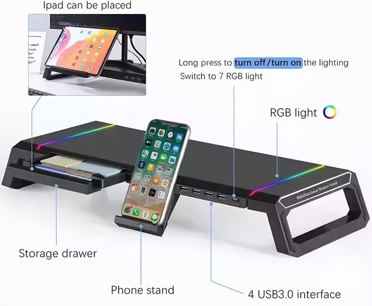Aluminum PC Monitor Stand – 4 USB Ports with USB 3.0 Fast Charging & Keyboard Storage | Space-Saving Laptop Stand